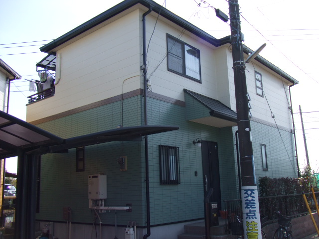 シリコン塗装1階タイル調のサイデイングに目地と色を変えてます。